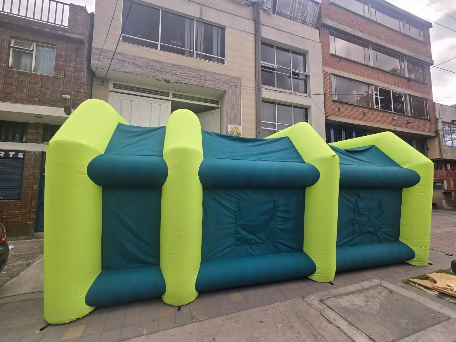 El piso hecho en lona pvc y morral nacional es resistente a todo tipo de vehículos, también puedes ser usados como garajes, podemos fabricar desde 3mt x 4mt x 7mt – 5mt x 3mt x 10mt, variación de tamaño del inflable y del motor para el ingreso de vehículos mas grandes y maquinaria pesada