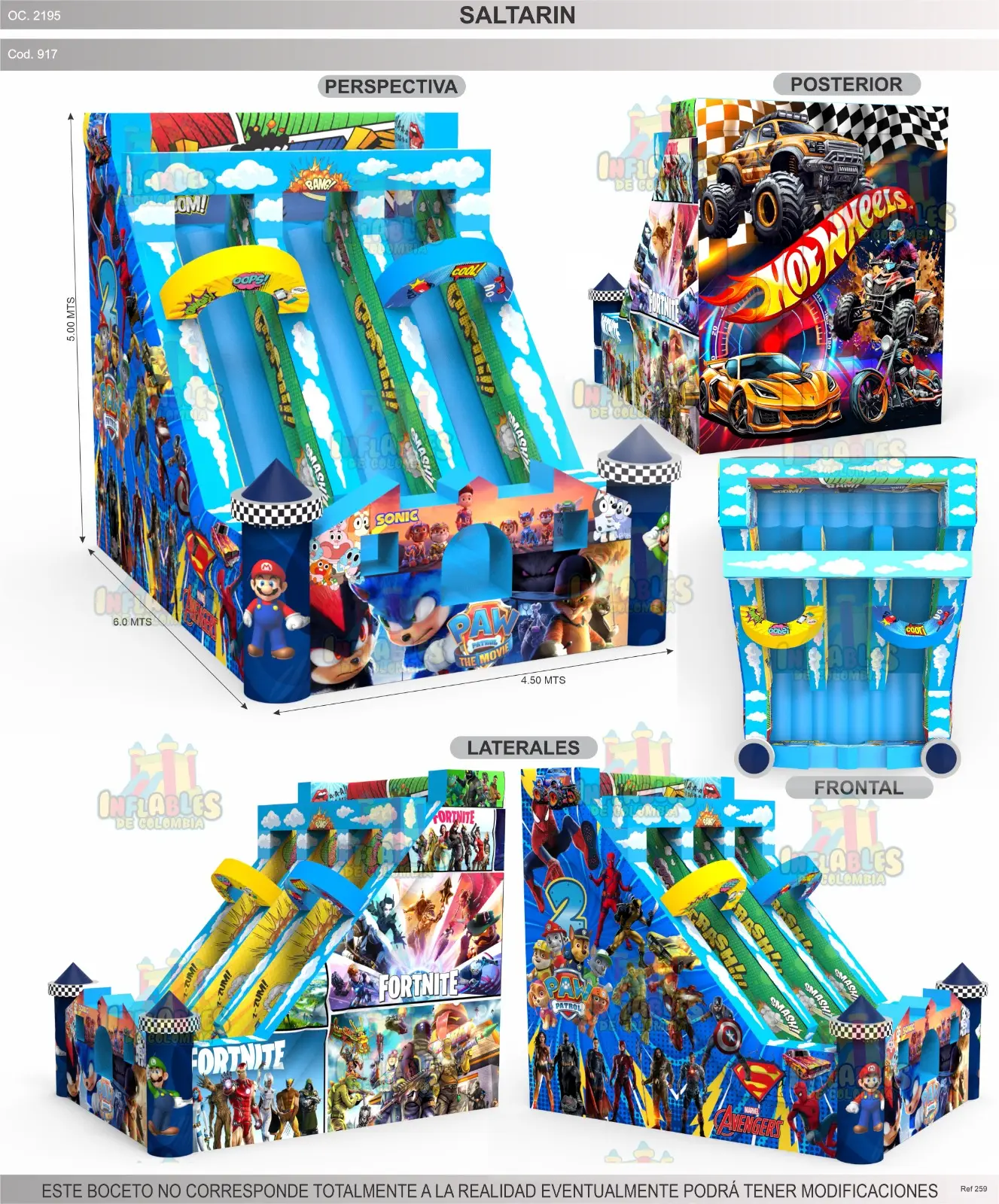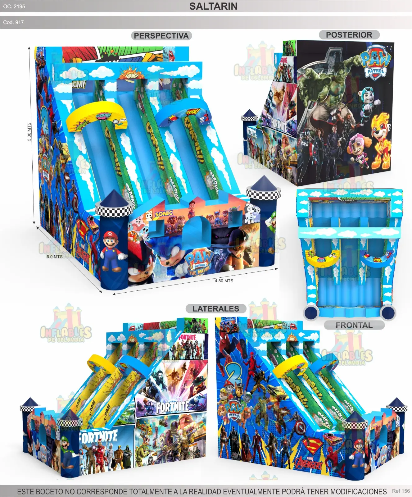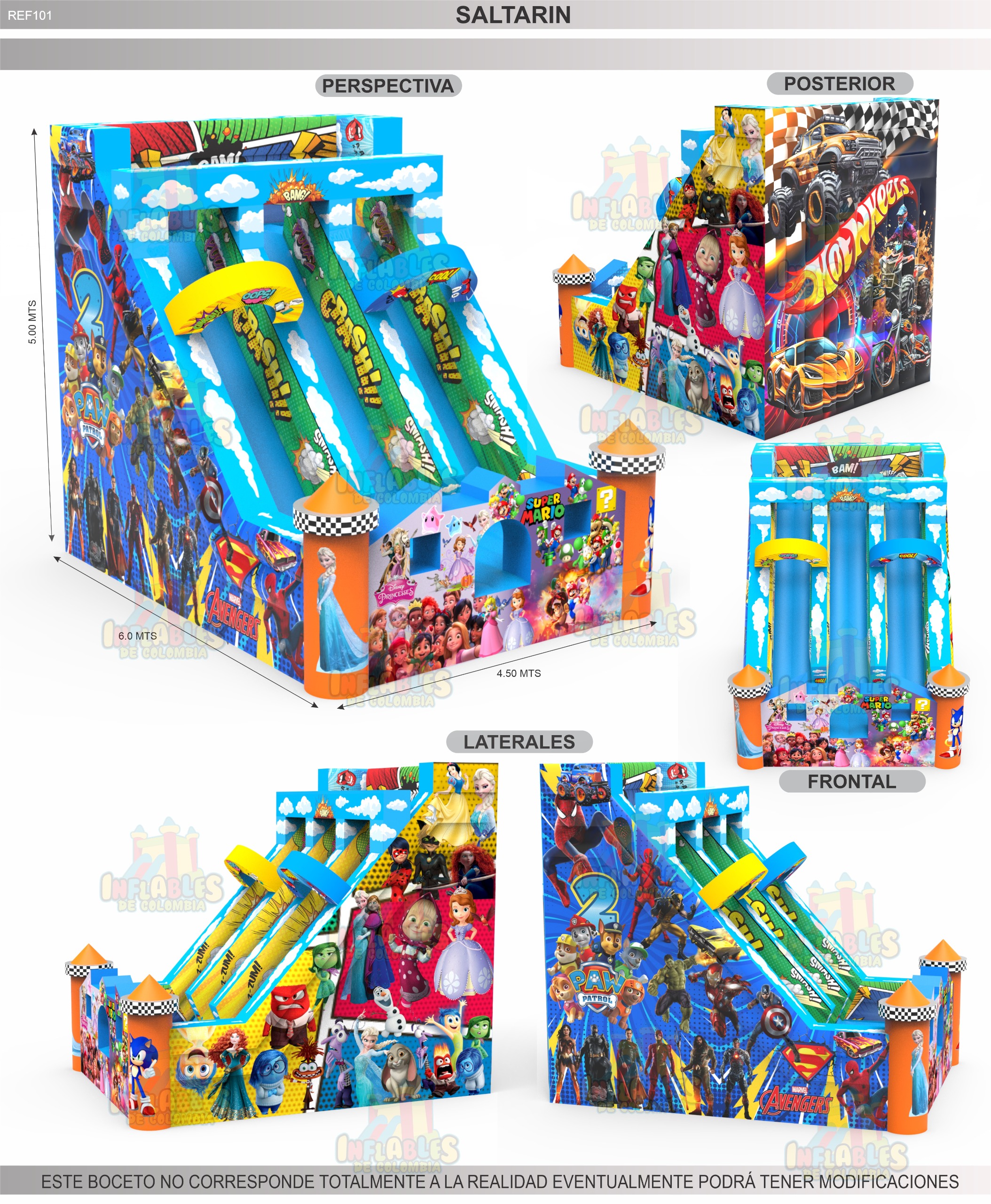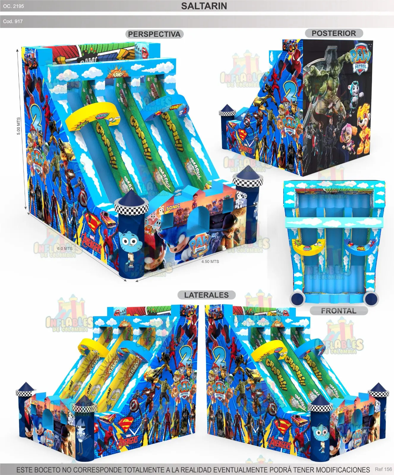 Totalmente Impreso con imágenes de Paw Patrol y Avengers, reforzado totalmente, se entrega con cobertores protectores en los deslizaderos, motor importado de 2HP 110v, kit de reparación, anclajes, amarres de viento, y 2 años de garantía