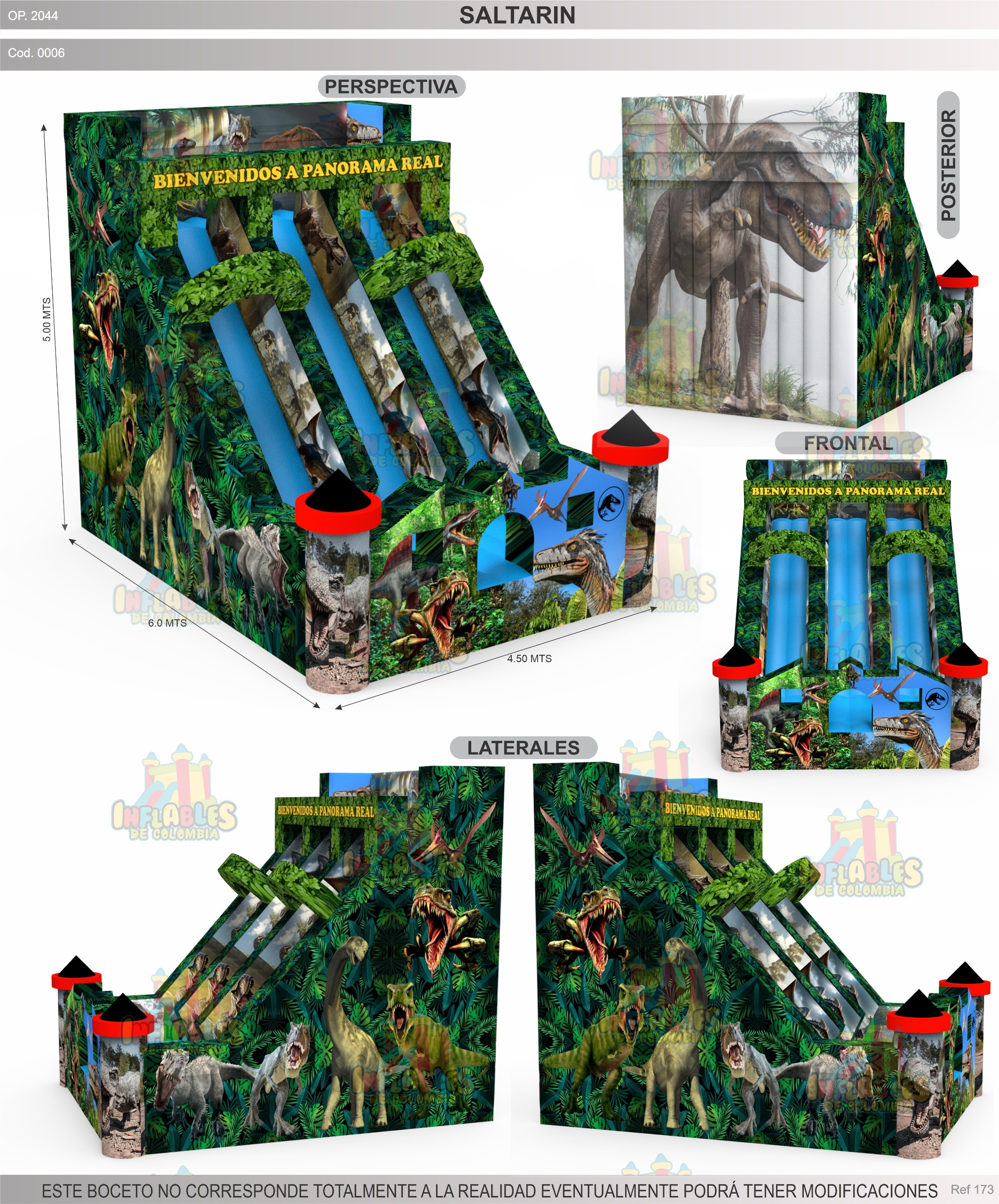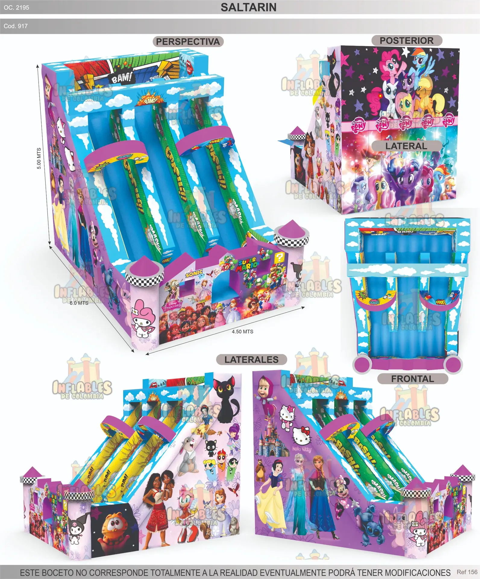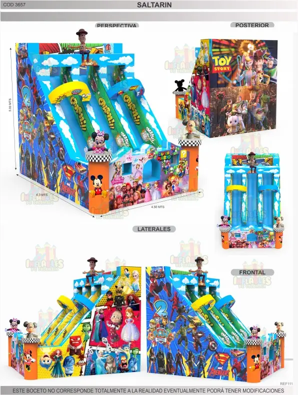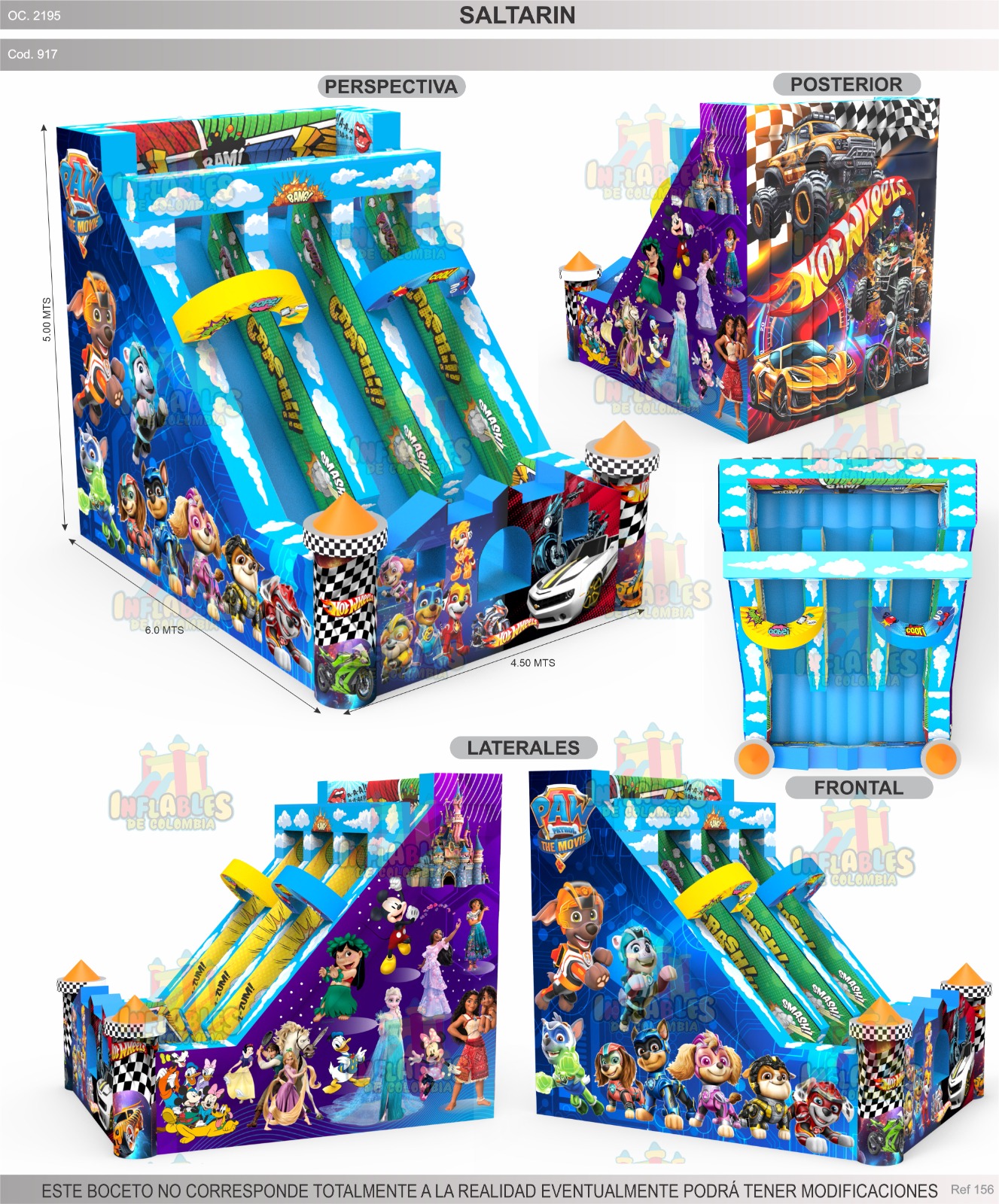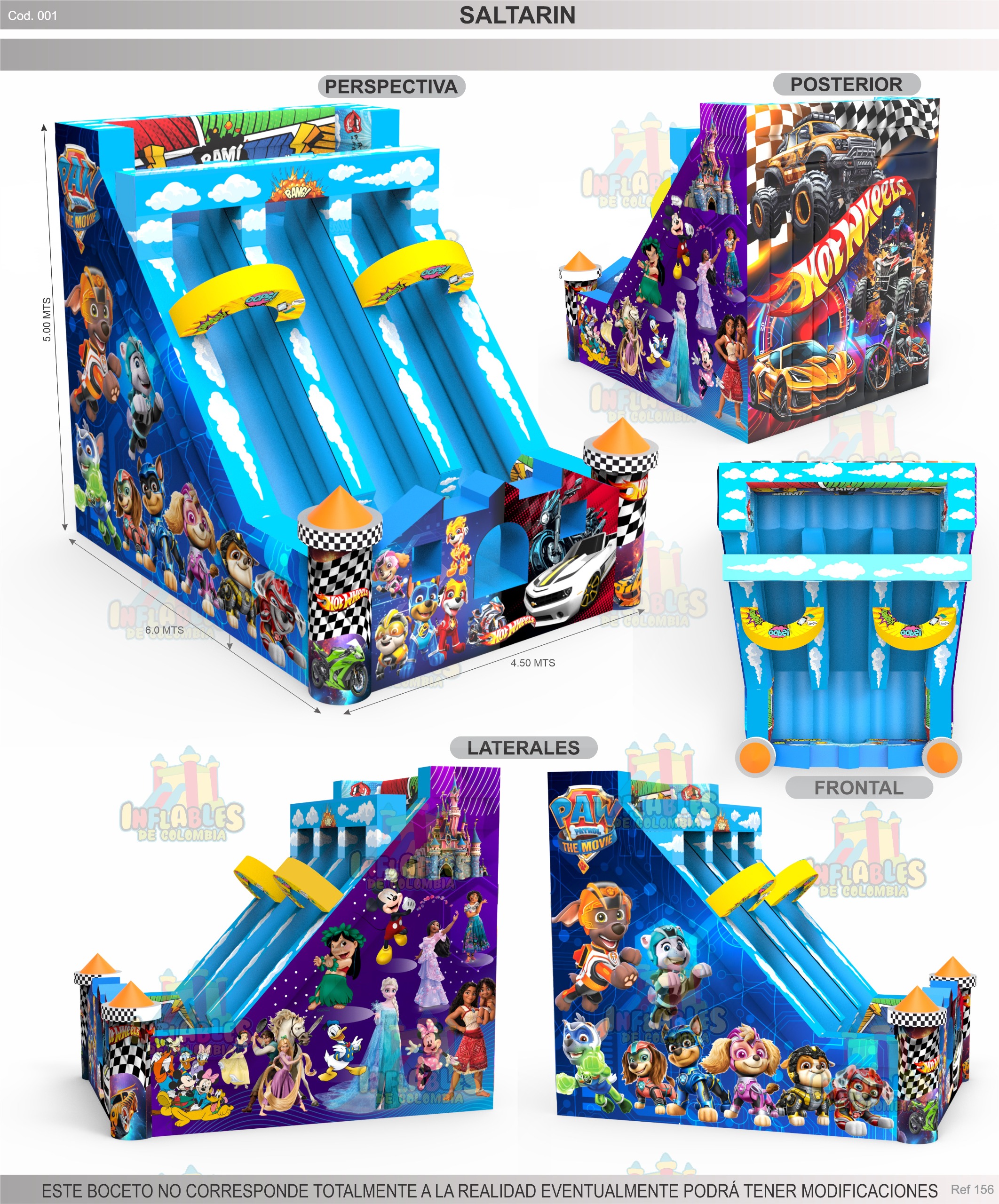 Totalmente Impreso con imágenes de Paw Patrol y Avengers, reforzado totalmente, se entrega con cobertores protectores en los deslizaderos, motor importado de 2HP 110v, kit de reparación, anclajes, amarres de viento, y 2 años de garantía