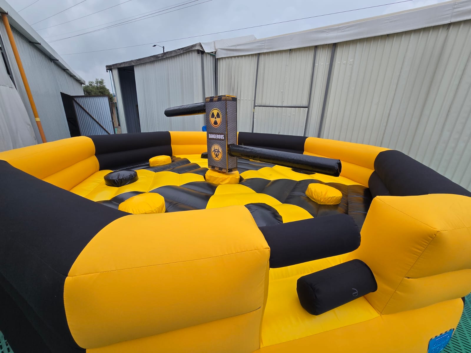Con un diámetro de 5 metros, este inflable ofrece el espacio perfecto para que hasta 6 u 8 personas participen simultáneamente, generando una experiencia dinámica, competitiva y llena de risas. Su combinación de colores amarillo y negro le da una apariencia moderna e impactante, ideal para captar la atención en cualquier tipo de evento.