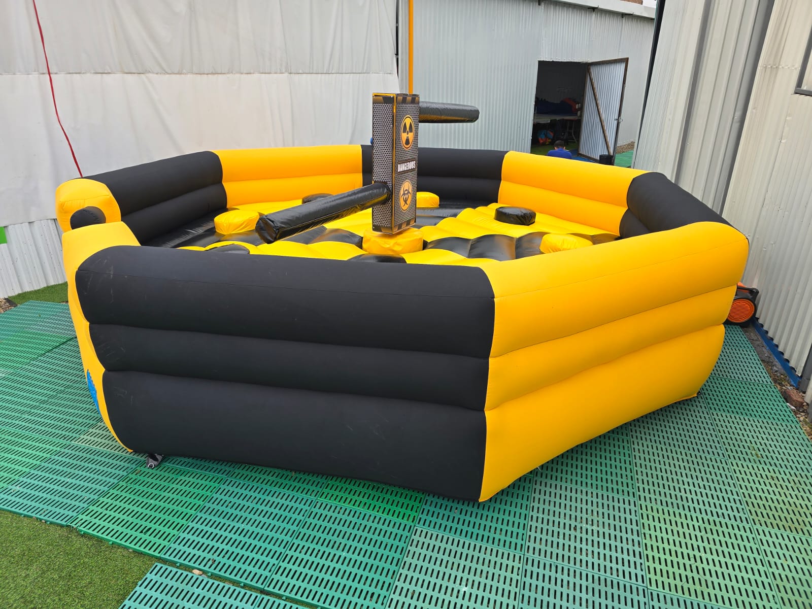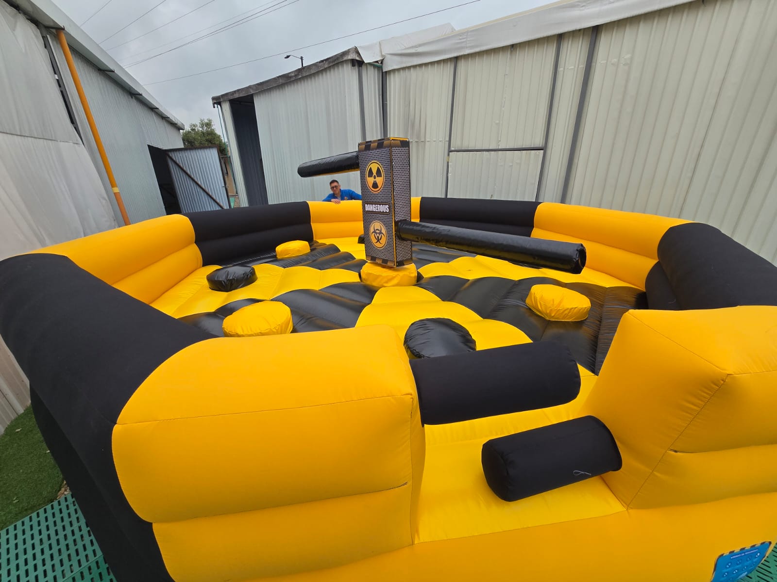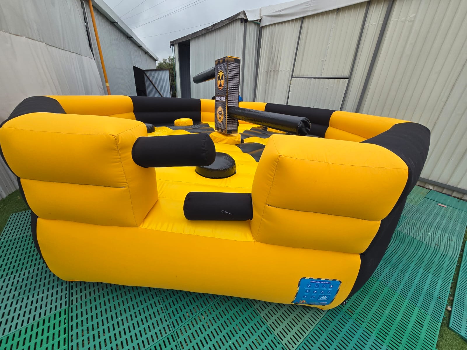 El sistema central giratorio incluye brazos acolchados que se mueven a diferentes alturas, aumentando el nivel de dificultad y haciendo que cada ronda sea impredecible y emocionante. Esta dinámica lo convierte en una actividad perfecta para competencias, retos grupales y activaciones de marca.